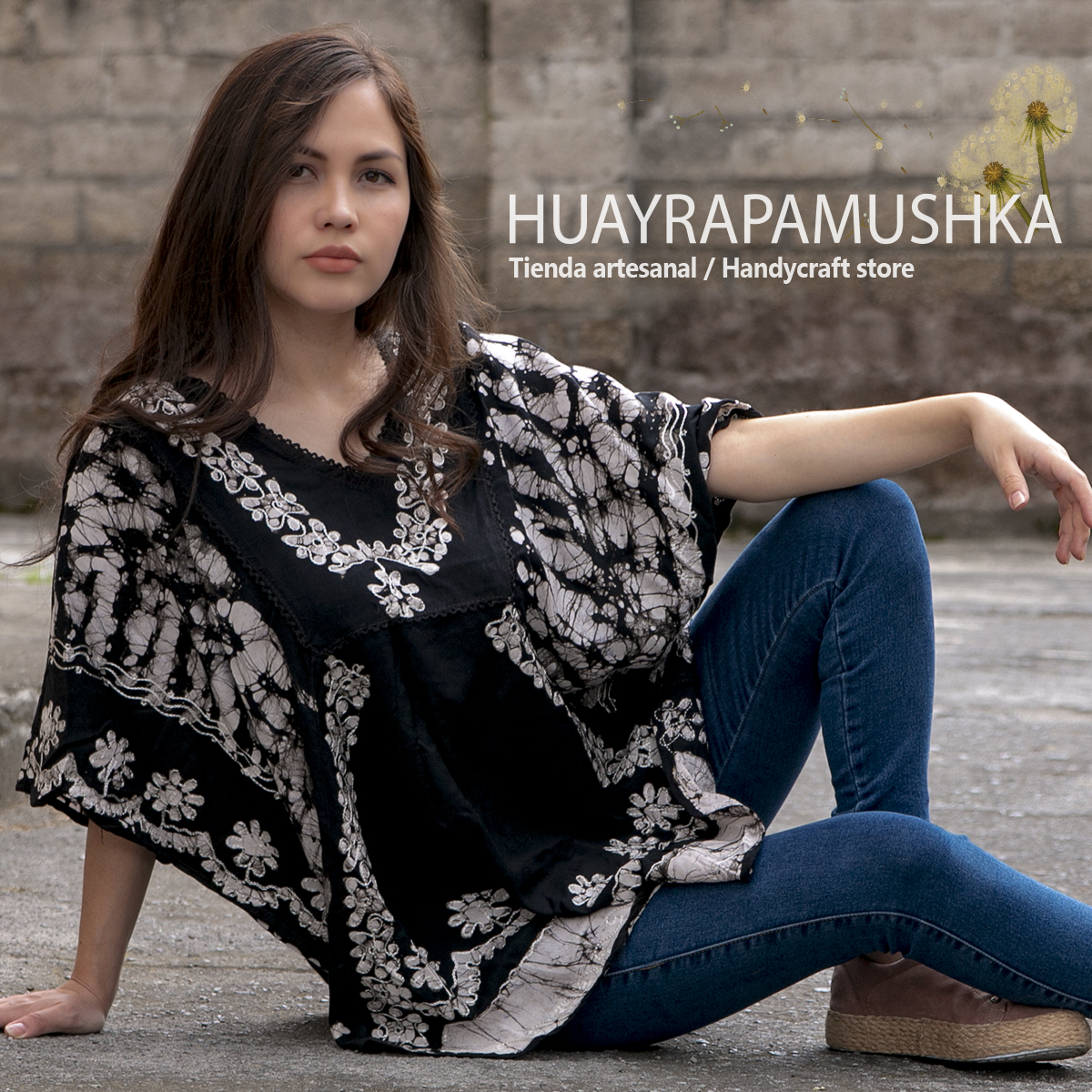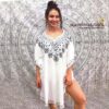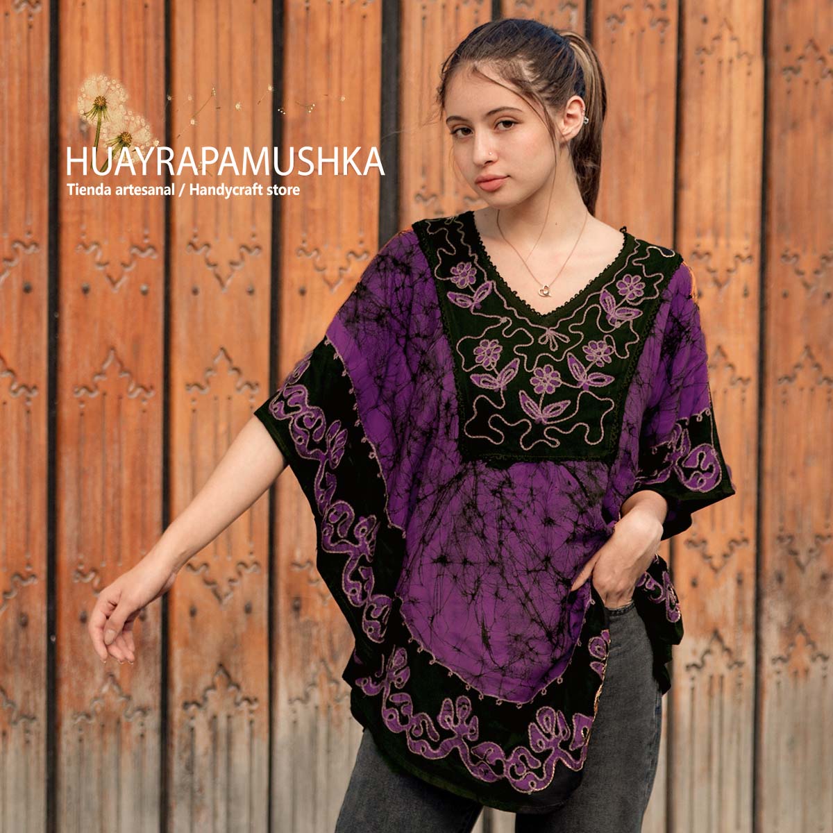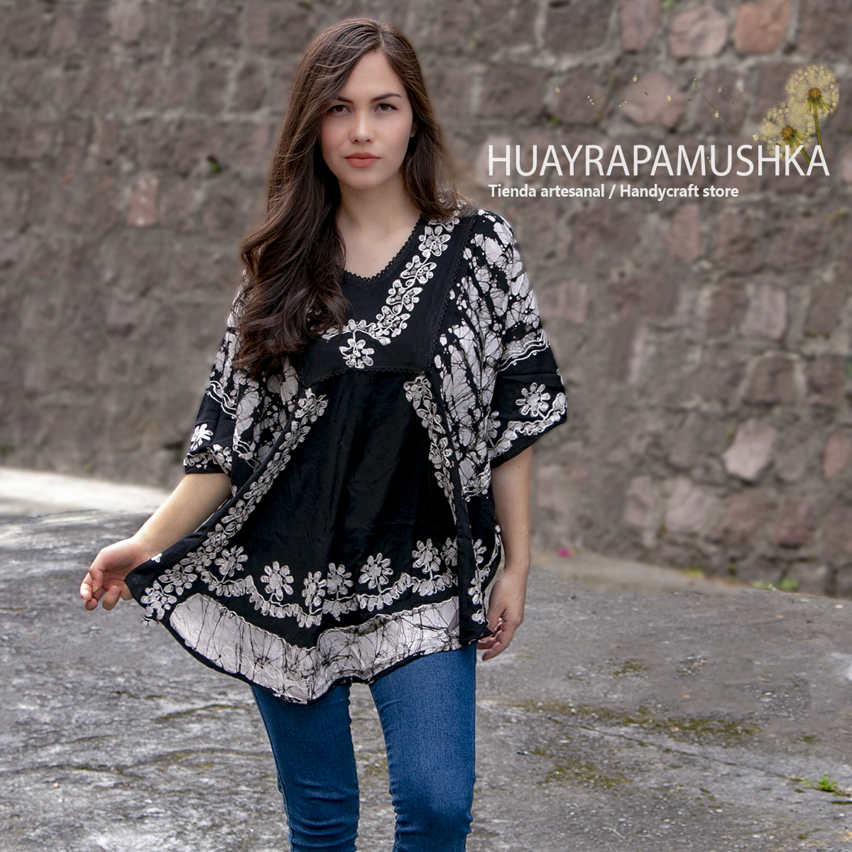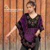 Blusón en rayón estampado y bordado, corte cuadrado tipo poncho con mangas sueltas