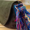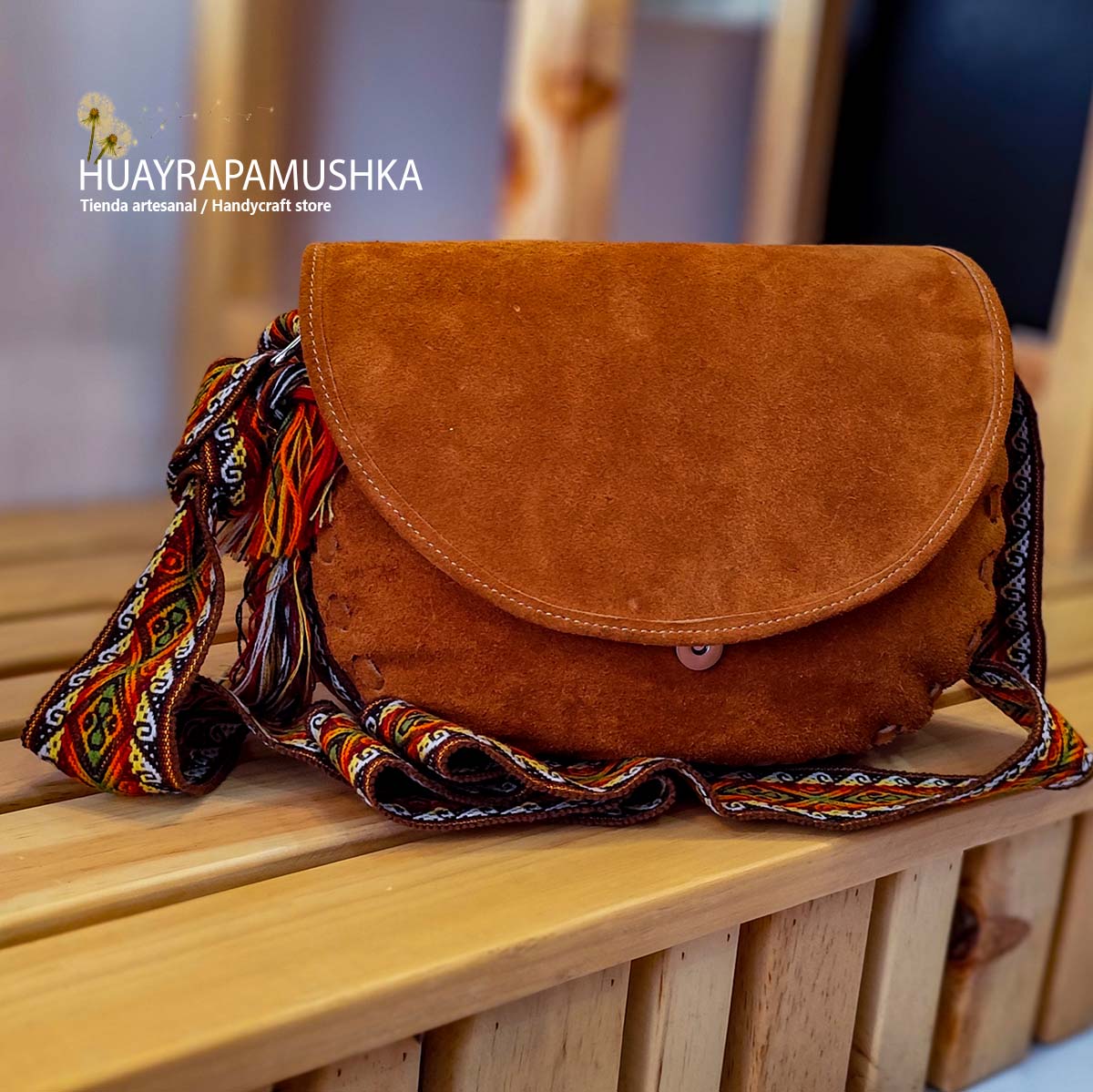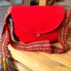 Cuero gamuza, faja tejida, cierre. Medidas bolso Chacha: 26 cm. de alto por 28 cm. de ancho