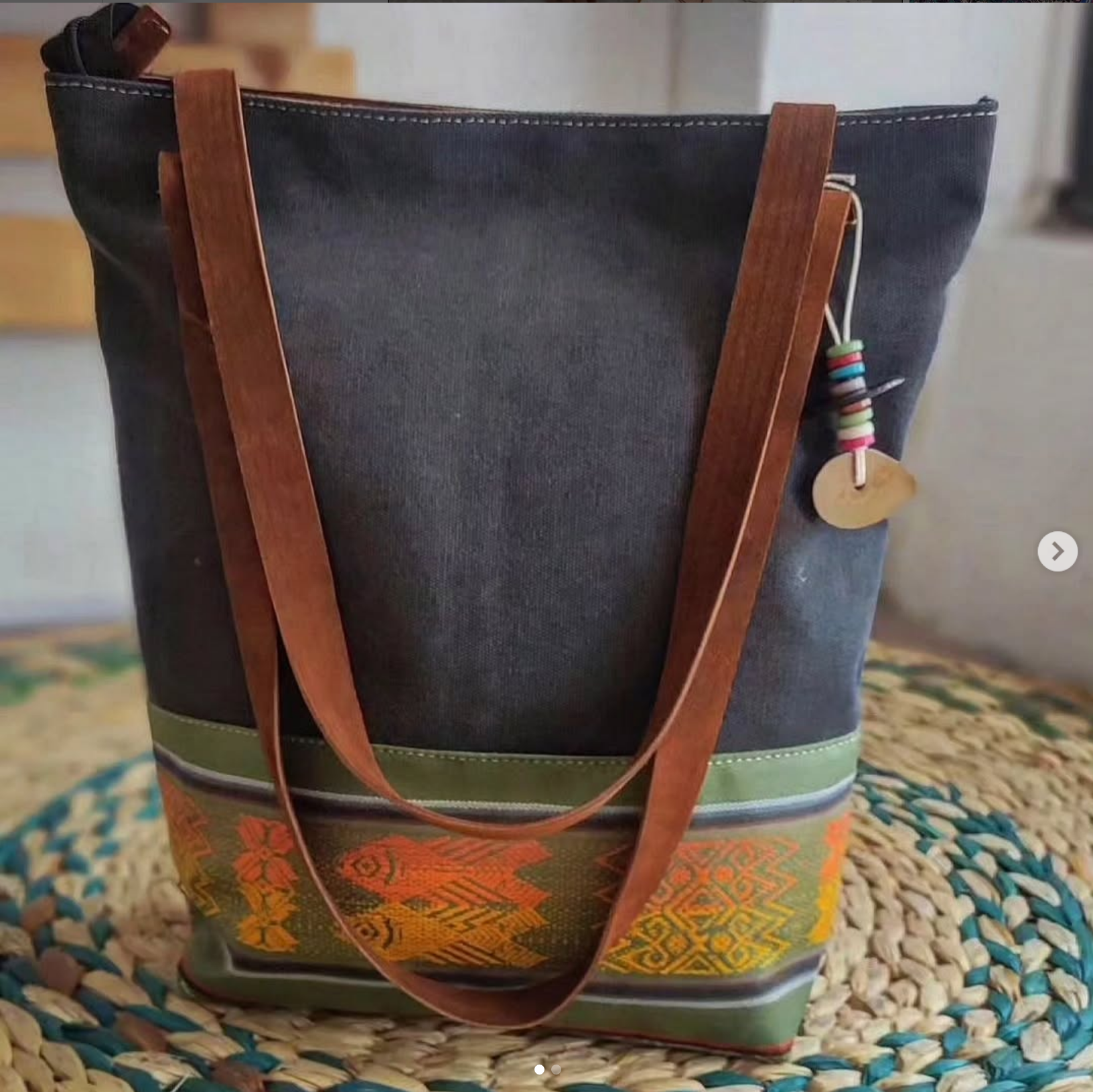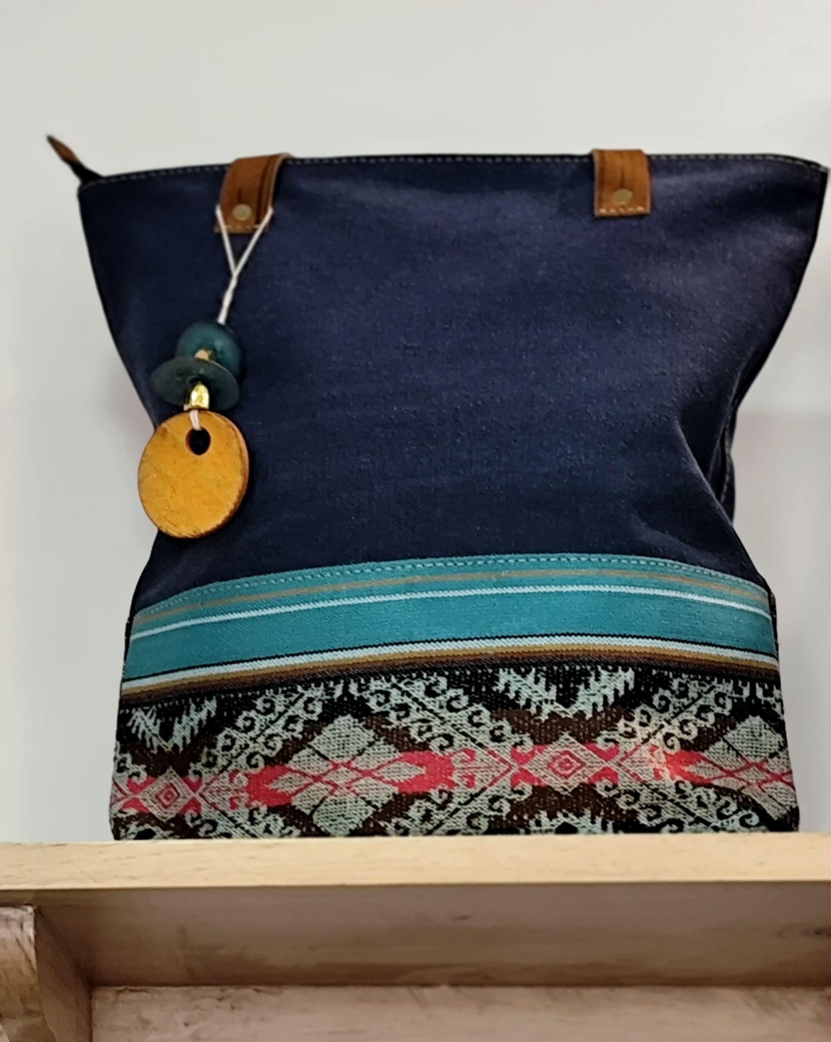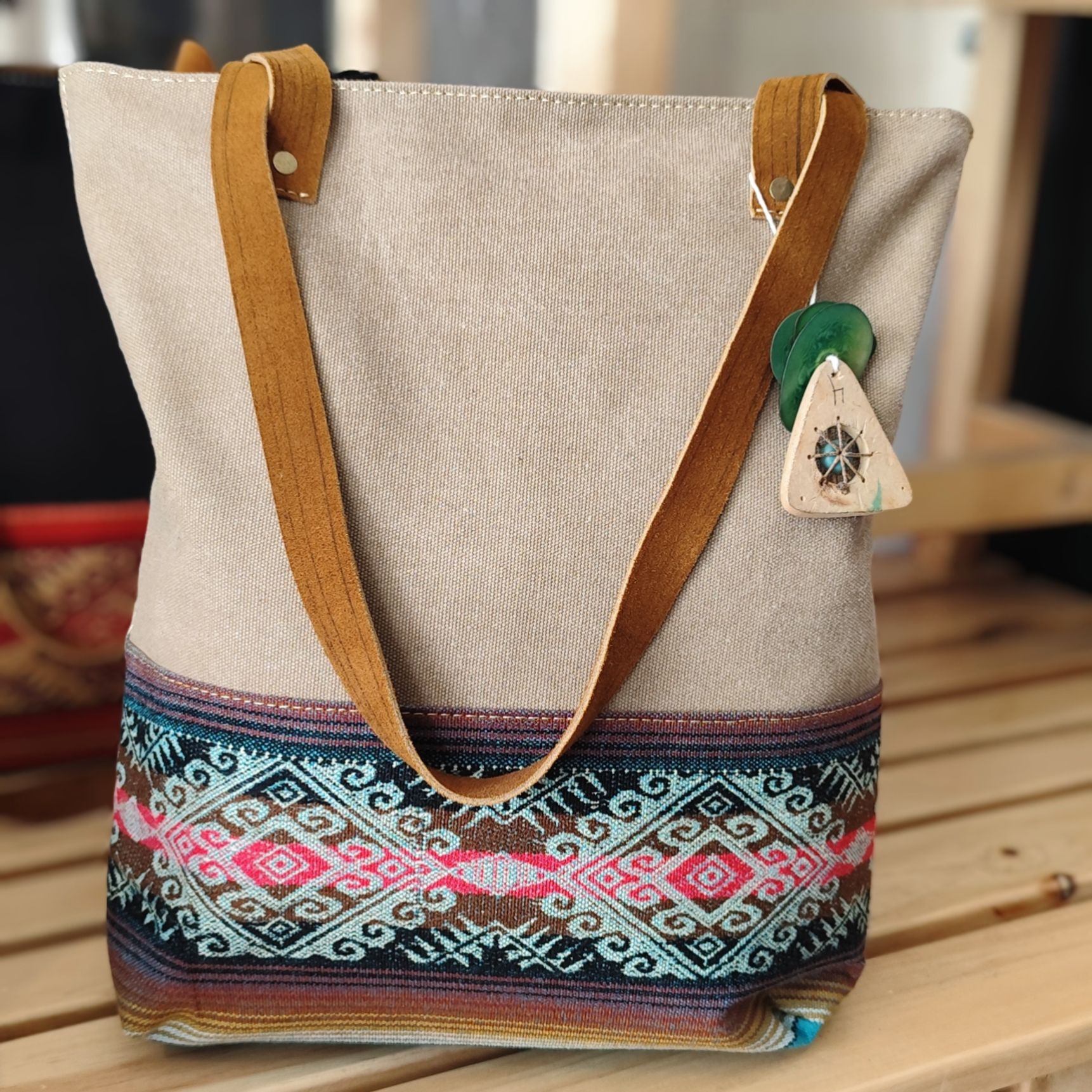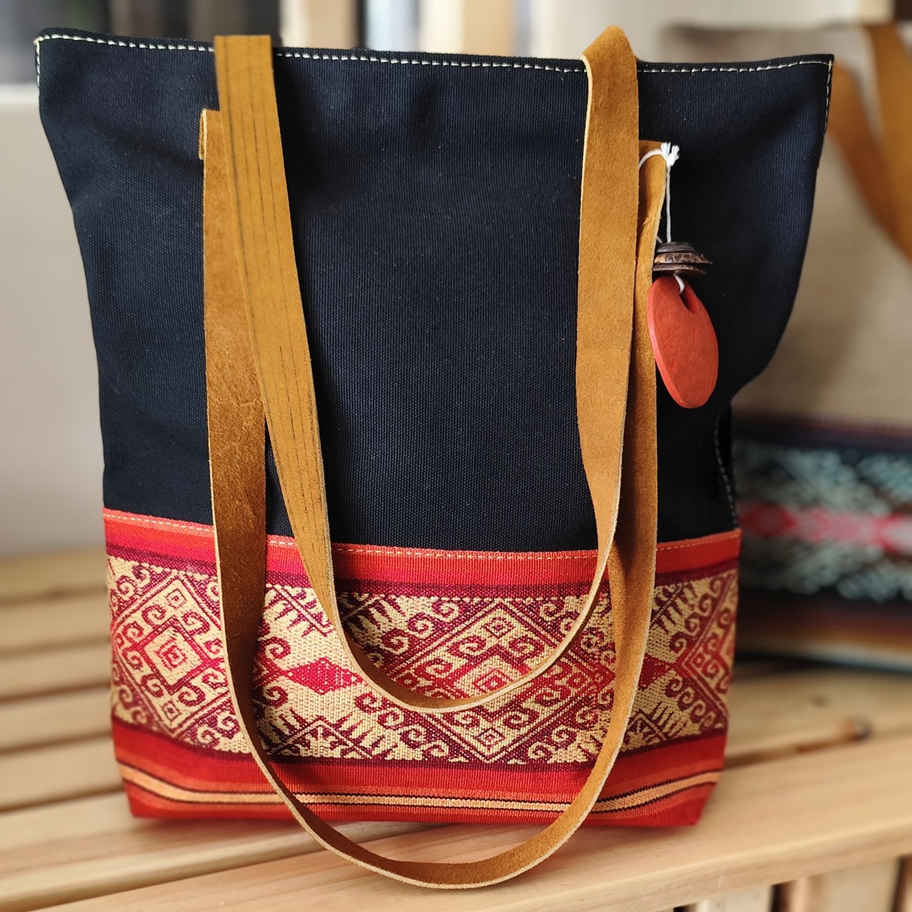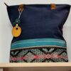 Lona, faja andina tejida, tiras de cuero y cierre. Medidas bolso Pacha: 32 cm. de alto por 30 cm. de ancho
