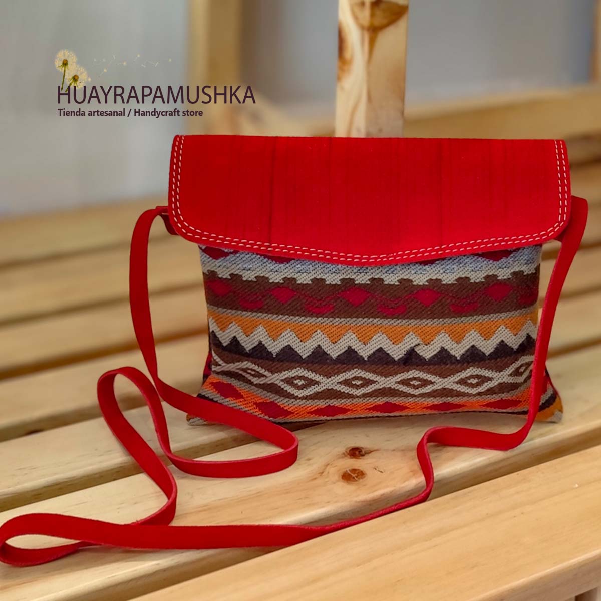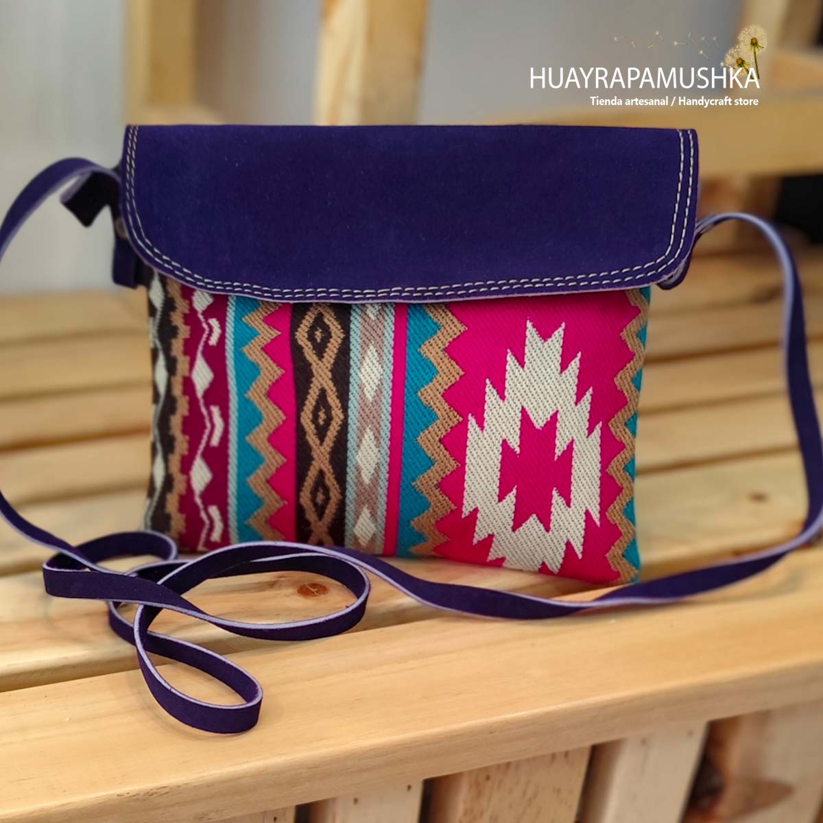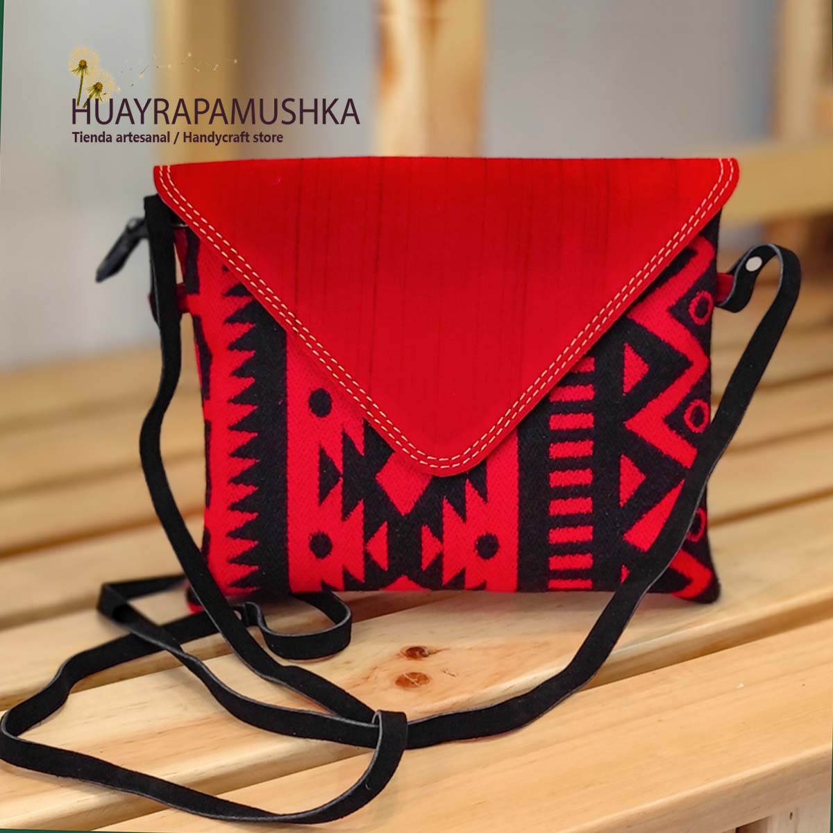 Tapiz andino tejido, cuero, cierre, y correa larga de cuero tamaño pequeño Medidas: Bolso Sobre 22.5 de ancho por 19 de largo incluido tapa
