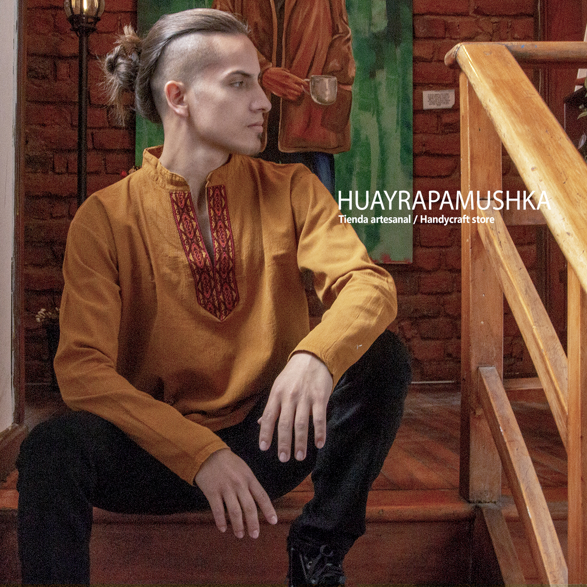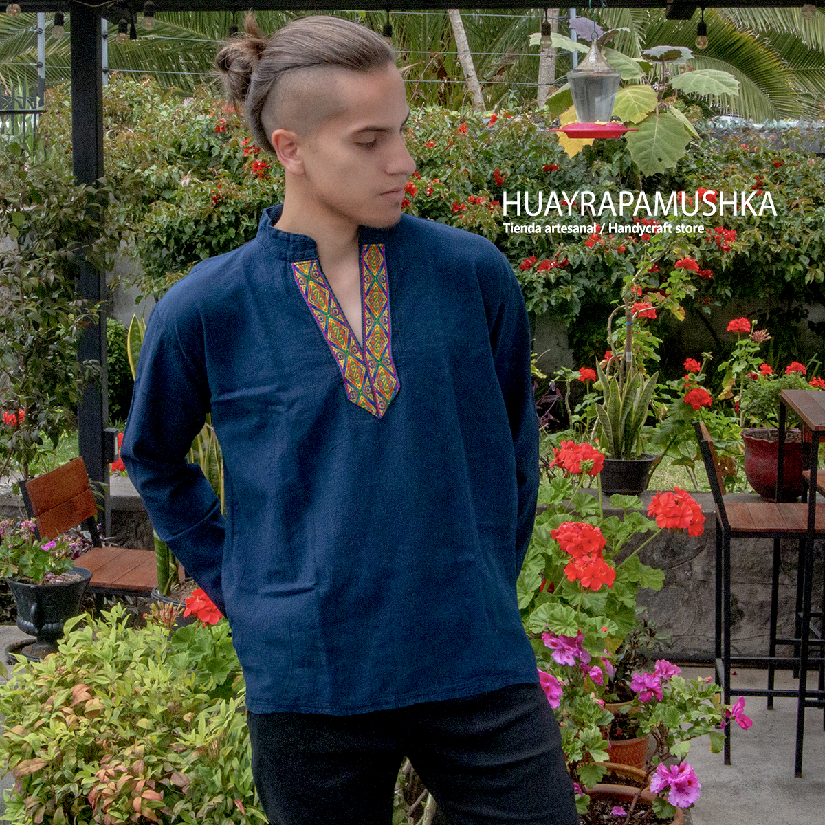 Camisa casual manga larga en algodón 100% con faja decorativa en el cuello de cuero