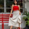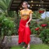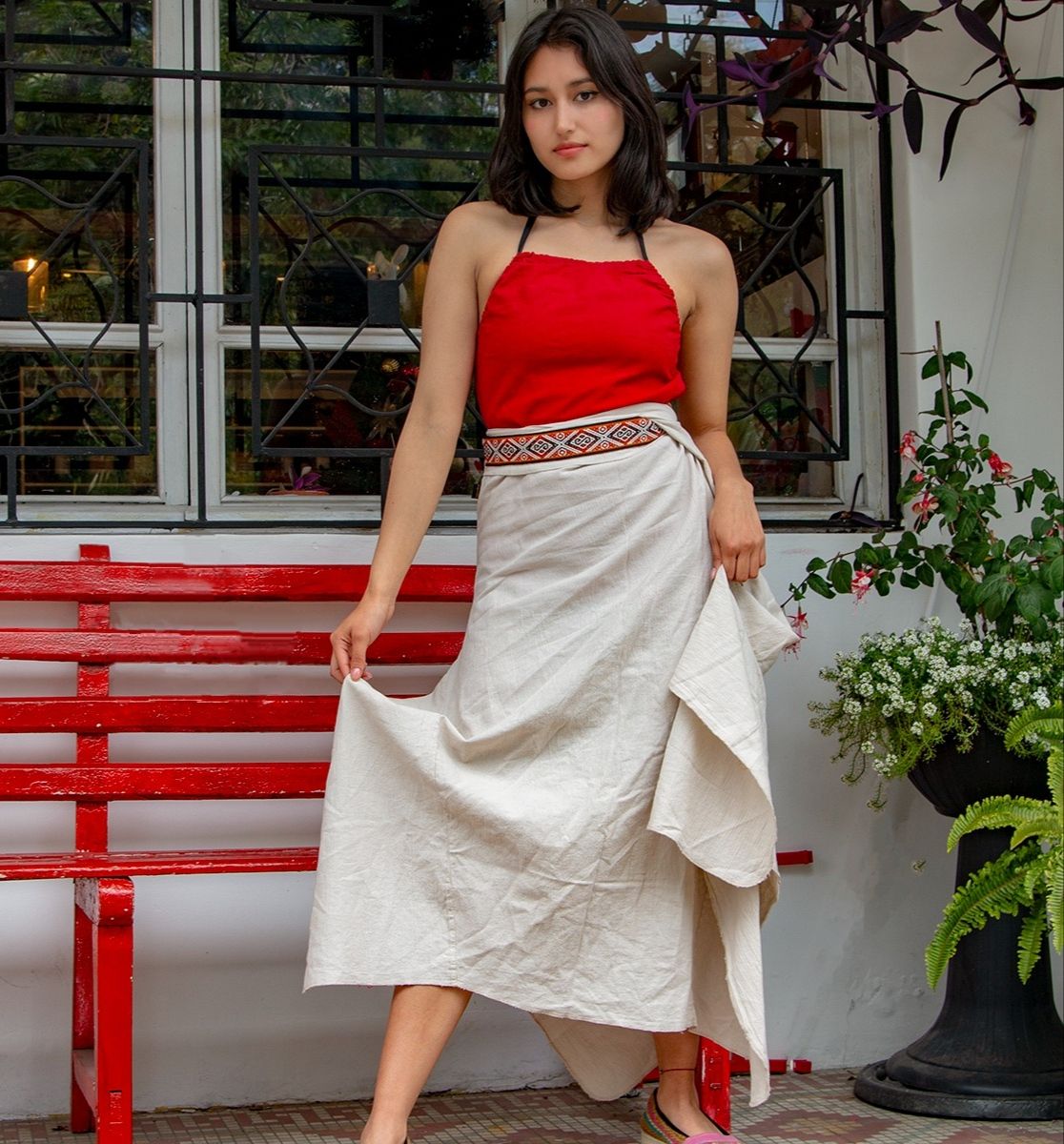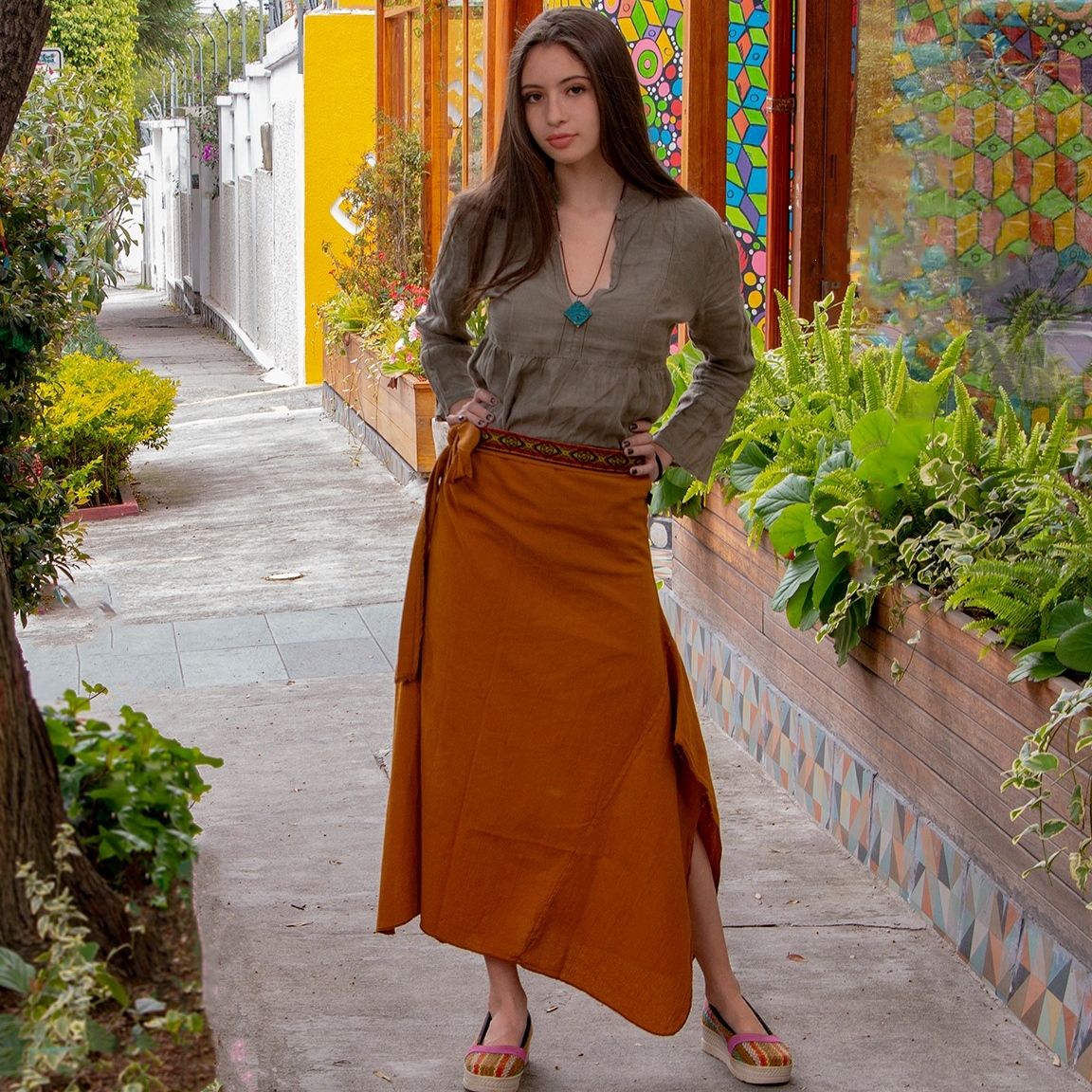 Falda tipo anaco andino, con encaje decorativo en la cintura, y tiras para marrar en la cintura