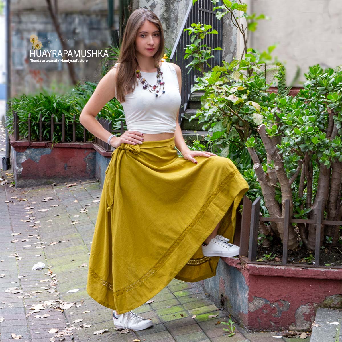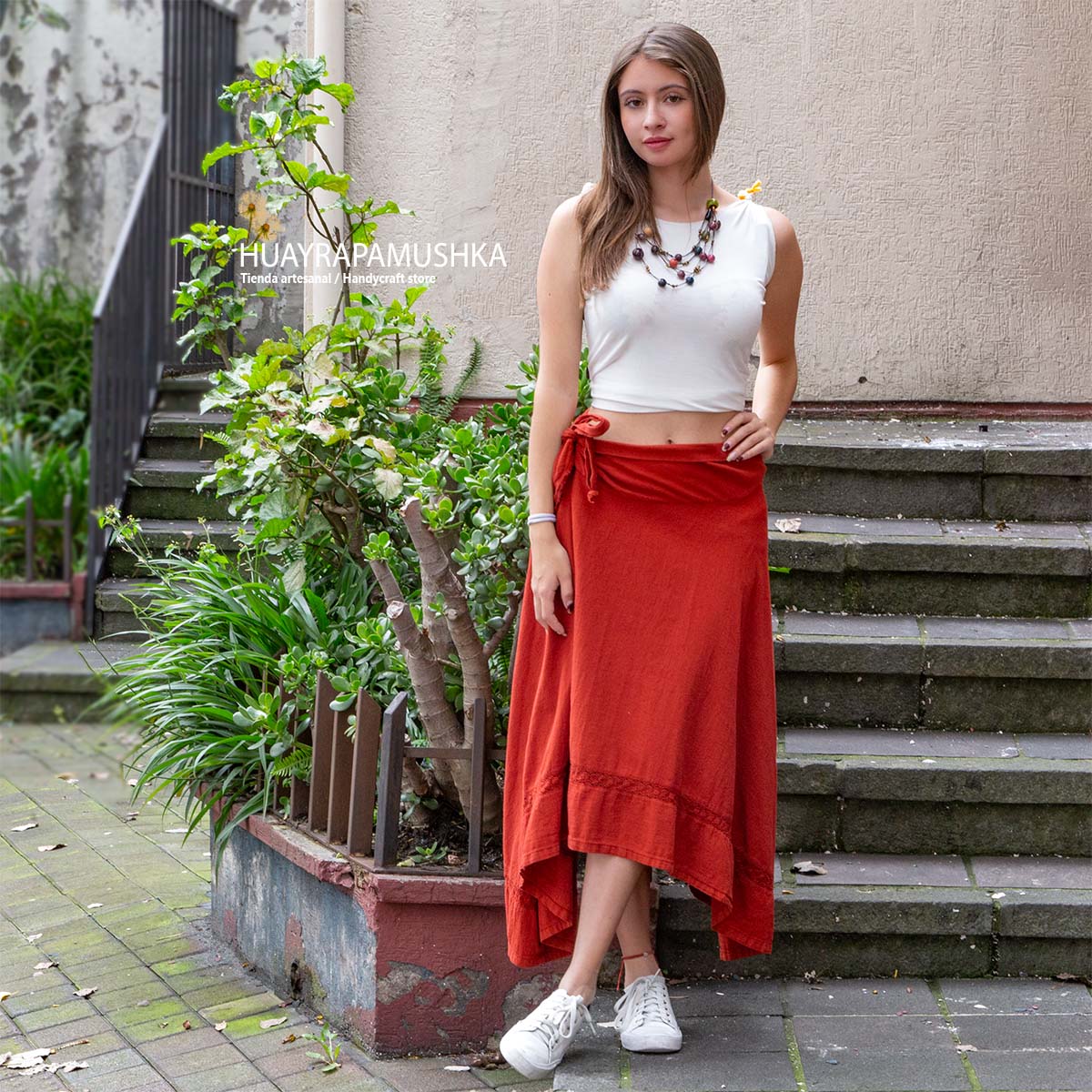 Falda larga en algodónn 100%,  maxi con caida en A hasta, se amarra en la cintura, tiene encaje en la parte baja de la falda