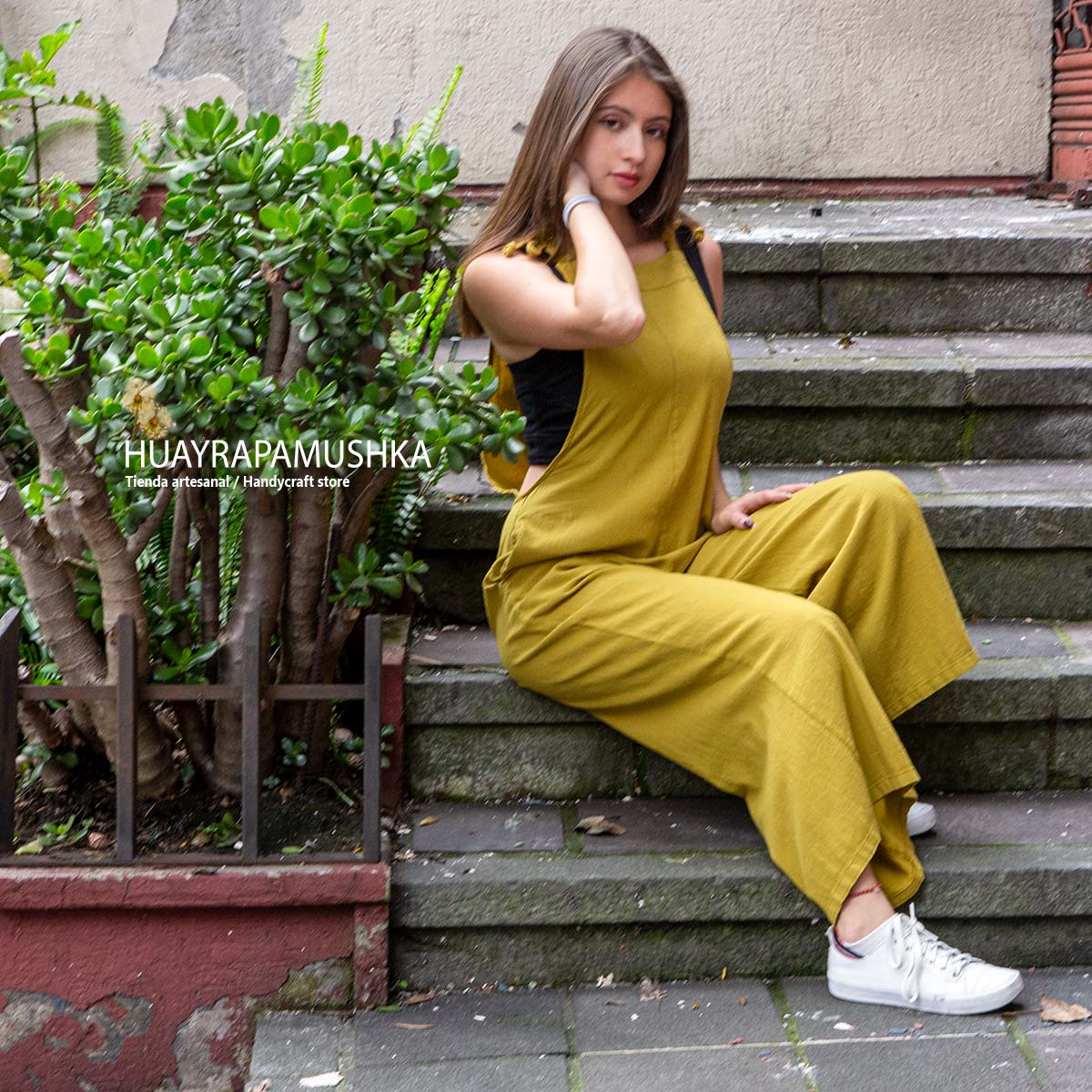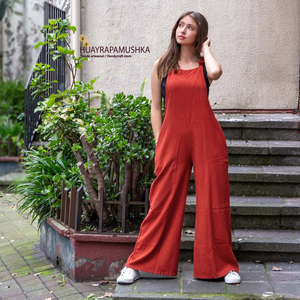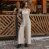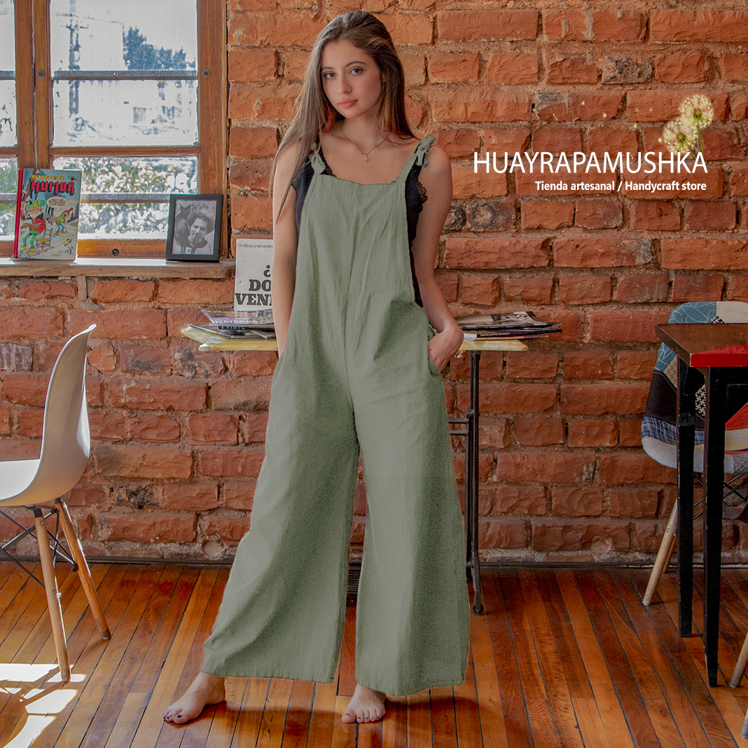 Enterizo tipo overol en algodón 100%, con tiras regulables para amarrar, bolsillos en el pantalón, corte semi acampanado