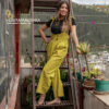 Pantalón tipo sastre con tirantes para amarrar, bolsillos laterales, cintura con faja elástica y botones decorativos